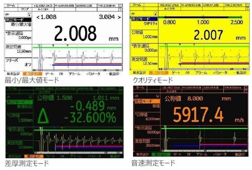 | 表示モード | 数値表示、音速測定、品質管理、Aスコープ、Bスコープ、最小/最大、差厚、データレコーダ |